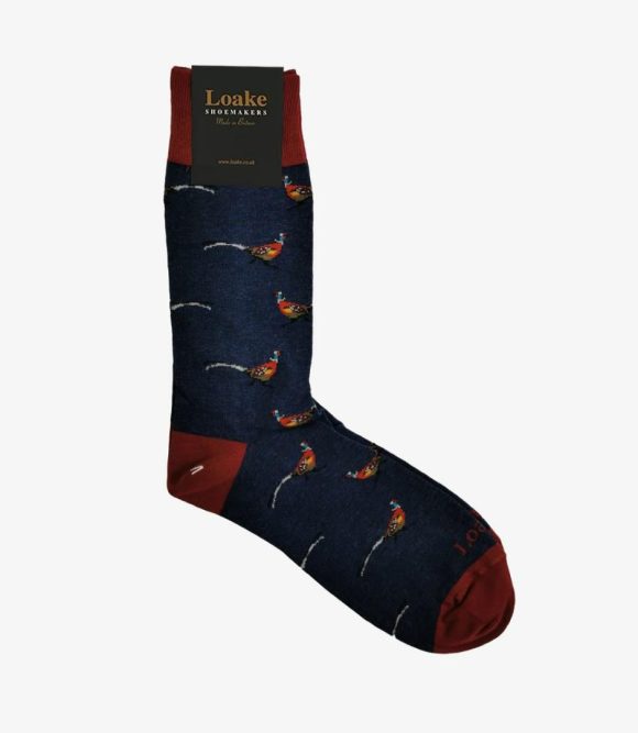 Premium Loake socks featuring a pheasant pattern with a navy background. These Loake accessories are perfect as an everyday sock, or even as a gift.